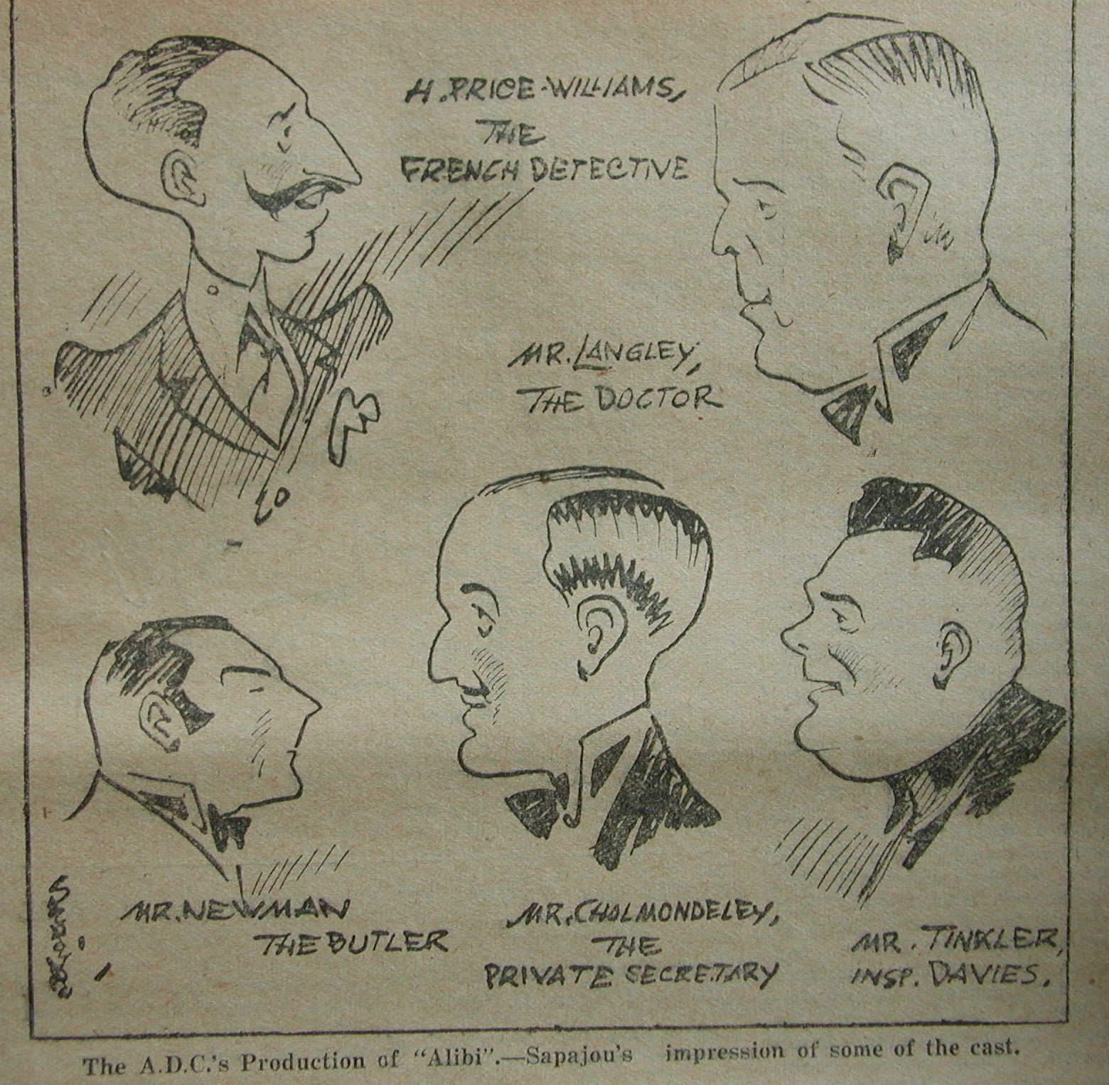 I was certainly unprepared for Maurice Tinkler the amatuer thespian, but here he is, skected by the wonderful Russian cartoonist ‘Sapajou’ (Georgi Sapajnikov) in the North China Herald. The date is April 1930, and the play is Agatha Christie’s ‘Alibi’, based on her book The Murder of Roger Ackroyd.