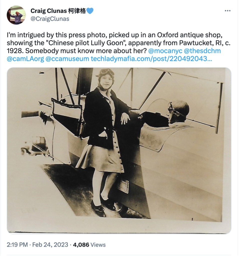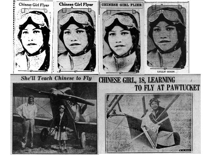 Henry Goon ‘Restaurateur’ died in Plainville, Massachusetts, in December 1941, but he was also of course ‘the father of the … Chinese aviator who learned to fly … but died before she realized an ambition to train flyers for China in its conflict with Japan’. But Lully lives on in this image and as this image. The photograph can be found online, and – evidently – in vintage markets too. She is recorded in a history of women pilots in China. If she was not the first Chinese American to learn to fly, she was one of the earliest who started to learn to. What lingers with me is this inspiring and cheerful image of a young nationalist, a modern, enjoying her day in the skies: ‘It was wonderful.’