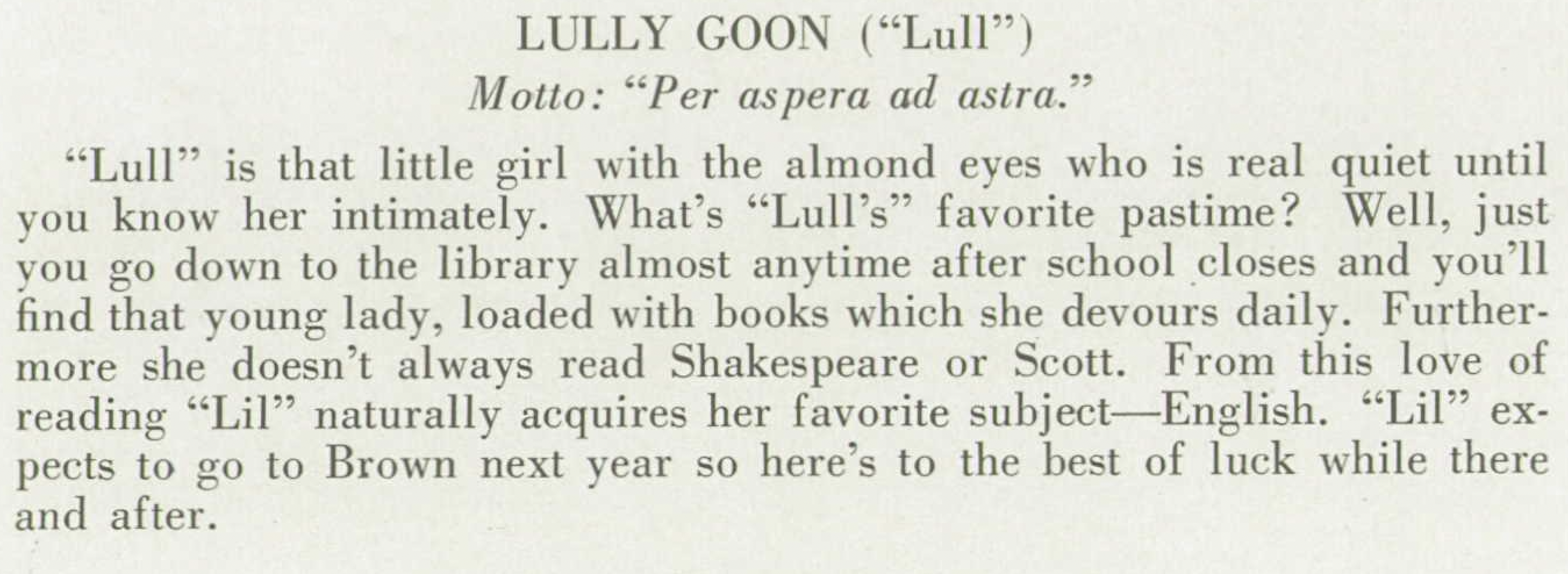 Lully first found her photograph in the local press in June 1927, as ‘the first Chinese girl to graduate from Pawtucket High School’[2] She had been a bookish student, according to her high school yearbook profile: