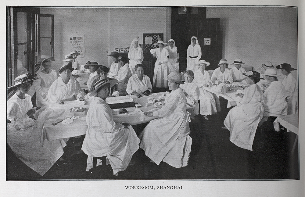 Annie, Lady de Sausmarez, whose husband was judge of the British Supreme Court for China, which sat in Shanghai, proposed on 25 September 1914 a scheme by which British women in Shanghai could supply garments and bandages for British troops in Europe. A British Women’s Work Association — the B.W.W.A. — was quickly established, sending its first packages to the Queen Mary’s Needlework Guild in London in November, and relaying thereafter a steady supply home.